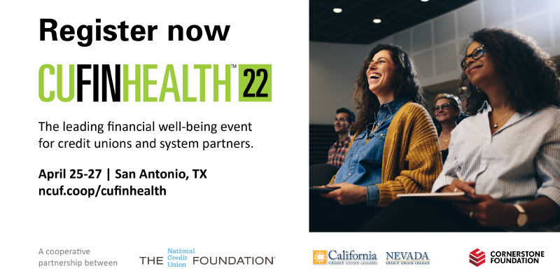 Join the Cornerstone Foundation, the National Credit Union Foundation, and the California and Nevada Credit Union Leagues for CUFinHealth22 this spring. The conference will examine how credit unions are measuring their members’ financial health and well-being, working to improve it, and documenting the results. Attendees will also explore the connections between financial well-being, physical health, technology, and advocacy.