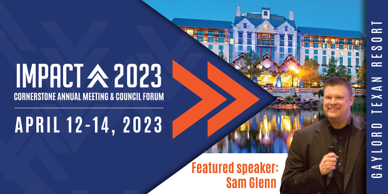 Cornerstone young professionals: Save the date for the 2023 IMPACT: Cornerstone Annual Meeting & Council Forum, April 12–14 at the Gaylord Texan Resort. Reserve your place now and get the early bird rate!
